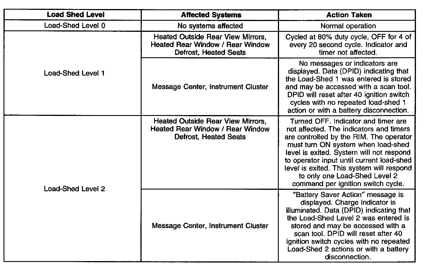 The DIM will either request an increase in the engine idle speed from the (PCM, VCM, ECM) or the DIM will turn off loads, called the load-shed function, in order to preserve the vehicle electrical system operation. The criteria used by the DIM to regulate this electrical load management.