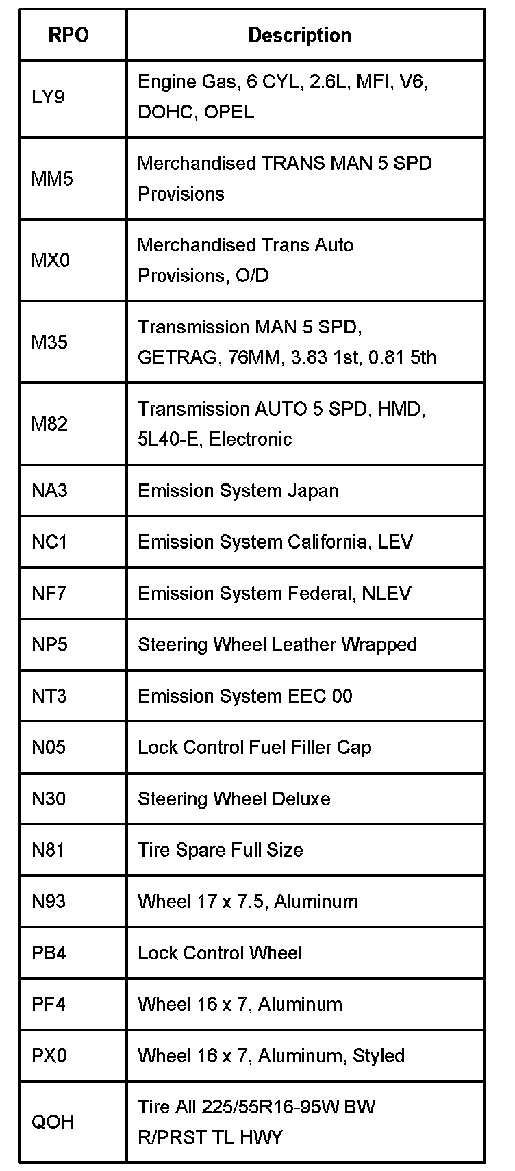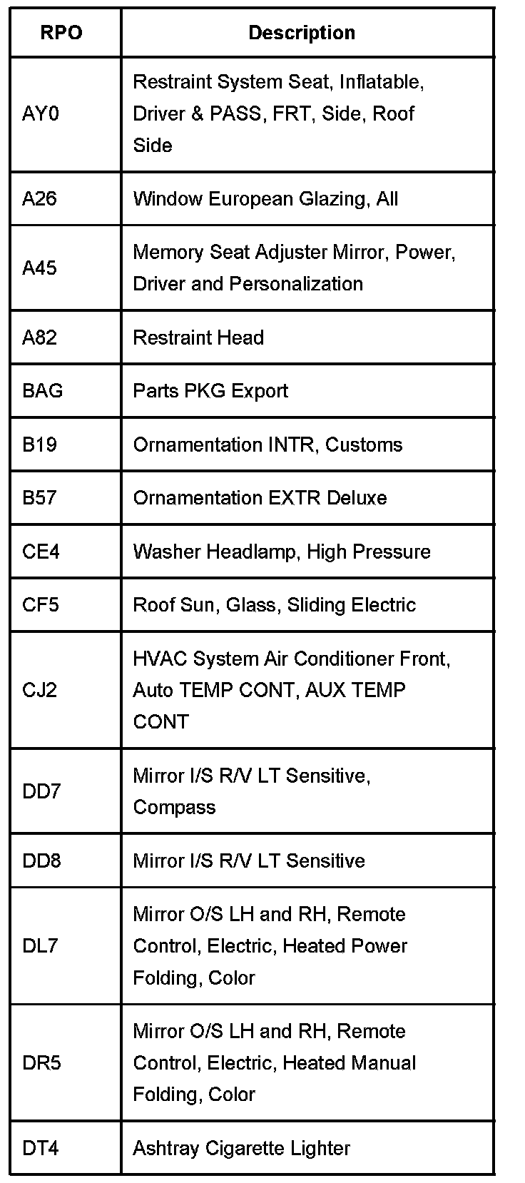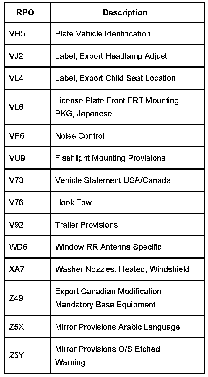The table provides the description of the Regular Production Option (RPO) codes that are available on the vehicle. The vehicles RPO list is printed on the Service Parts Identification Label.