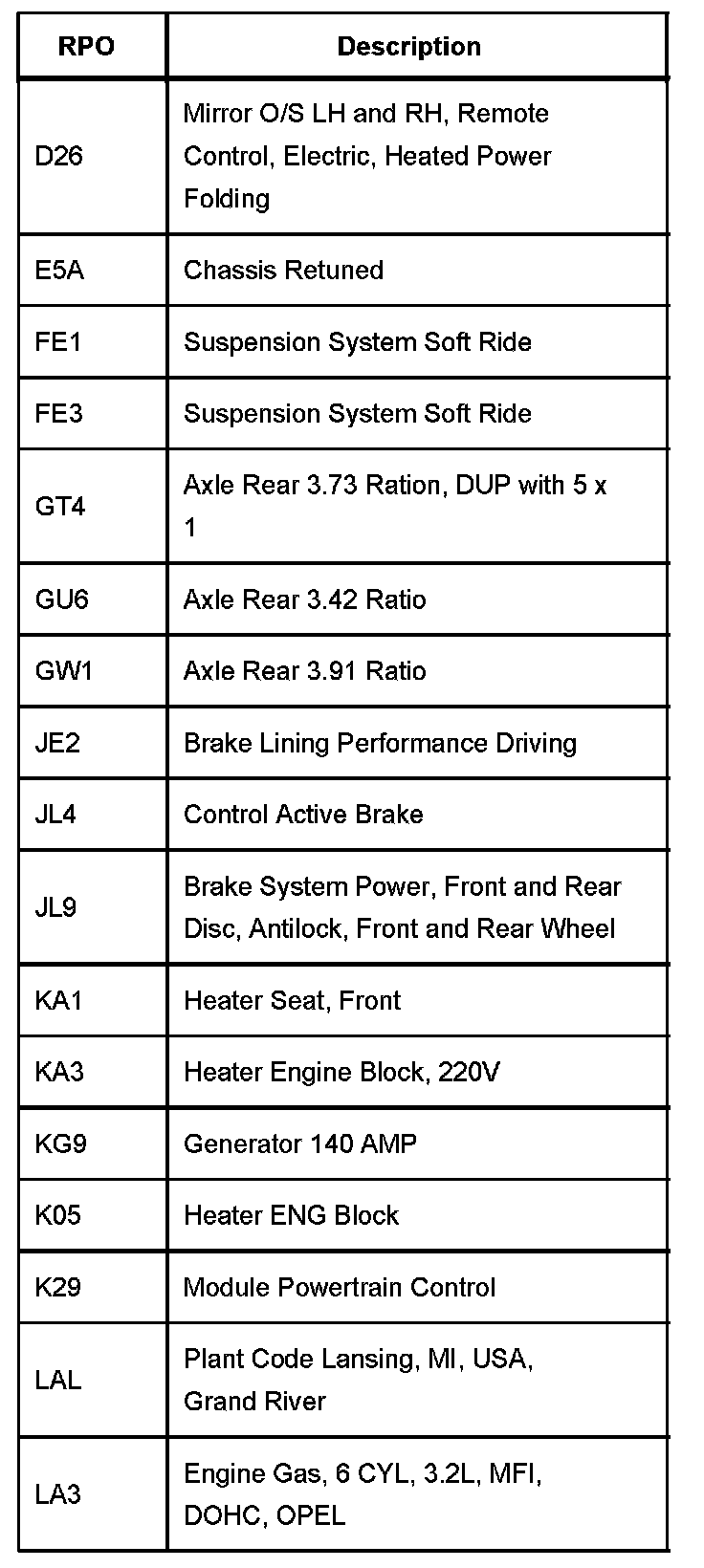 RPO Code List Part 3 (D2 - LA):
