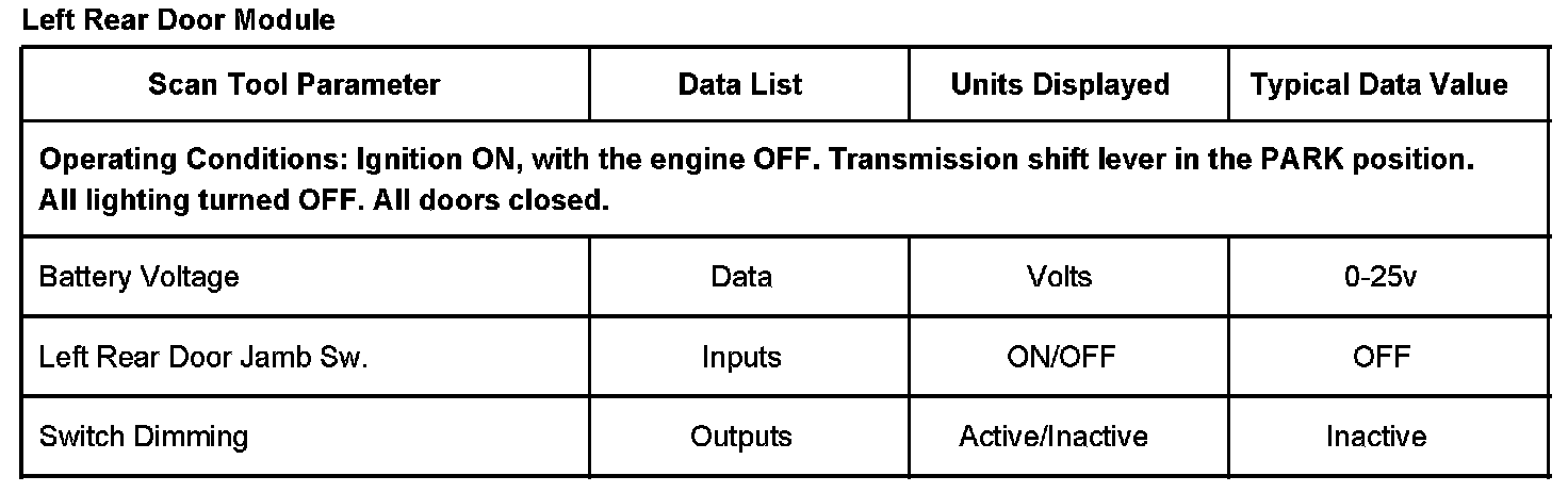Left Rear Door Module Scan Tool Data List: