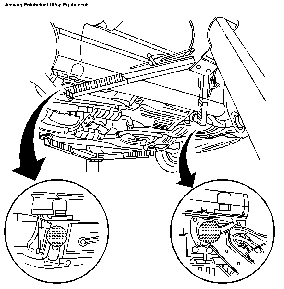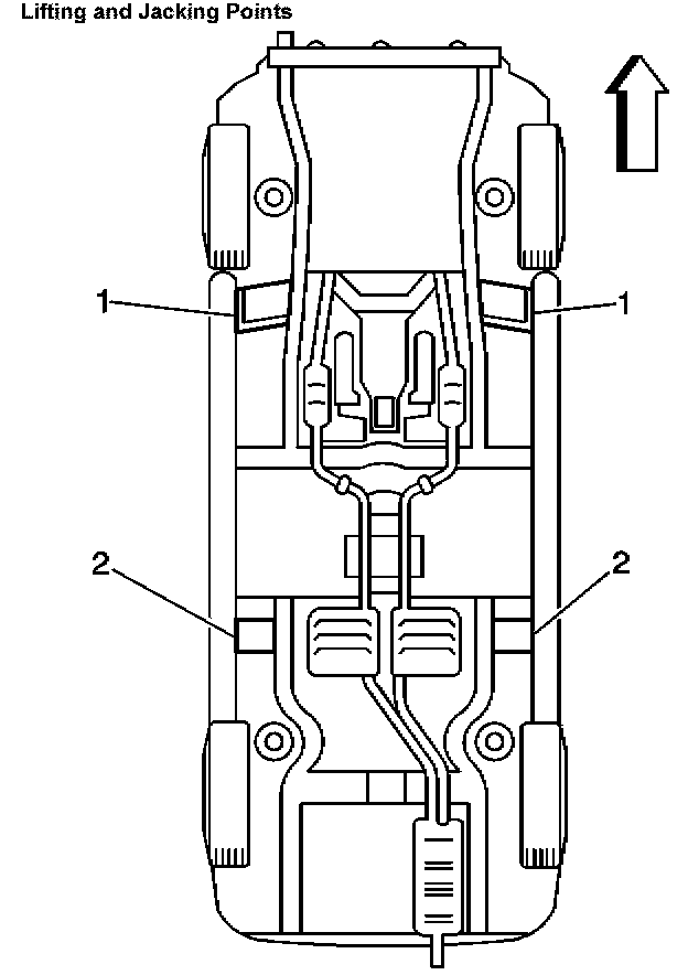 NOTE: When you are jacking or lifting a vehicle at the frame side rails or other prescribed lift points, be certain that the lift pads do not contact the catalytic converter, the brake pipes or the fuel lines. If such contact occurs, vehicle damage or unsatisfactory vehicle performance may result.
