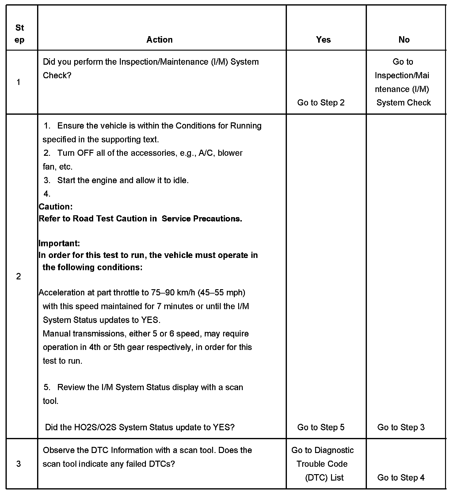 The purpose of this test is to satisfy the enable criteria necessary to execute I/M readiness diagnostics for the oxygen sensor (O2S, HO2S) system. The test may be used to set the I/M System Status to YES. Ensure the vehicle meets the requirements listed in Conditions for Running before performing this test. Failure to meet the necessary requirements may produce inaccurate test results.