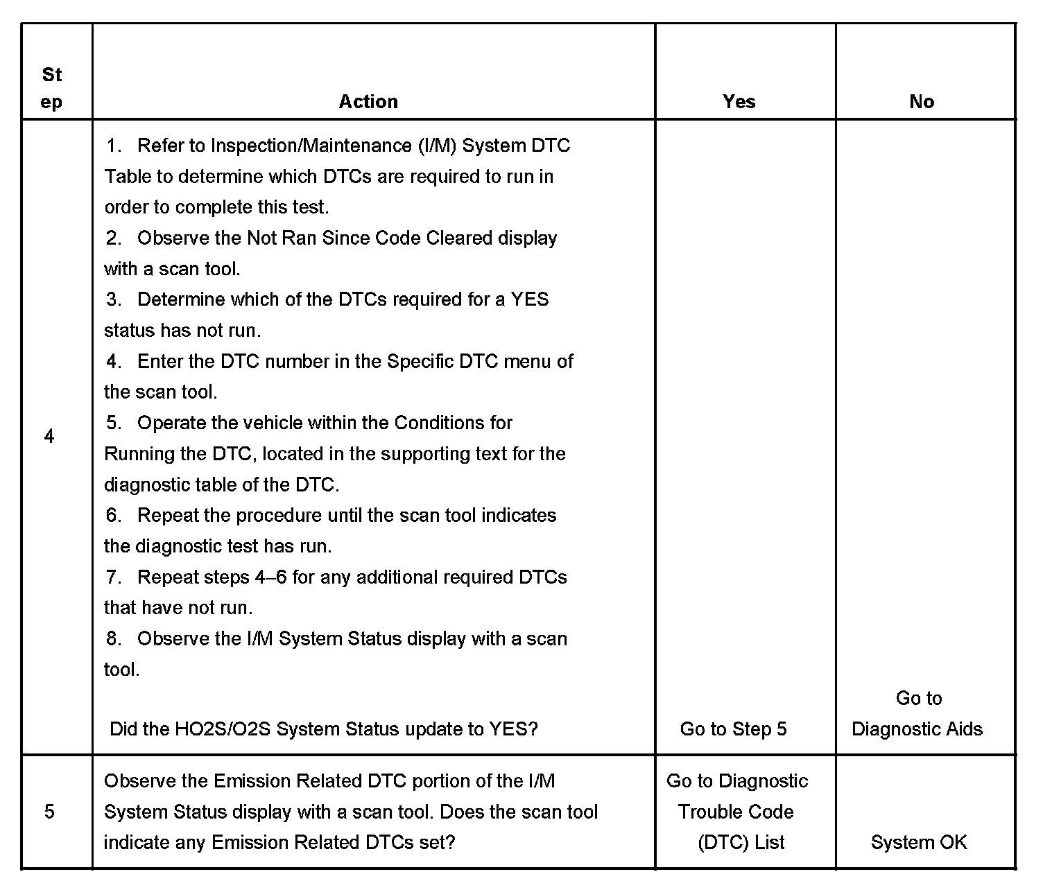5. The I/M System Status only reports on whether or not a diagnostic has run, not what the outcome of the test was. If any Emission Related DTC sets after the tests are complete, the DTC will require diagnosis.