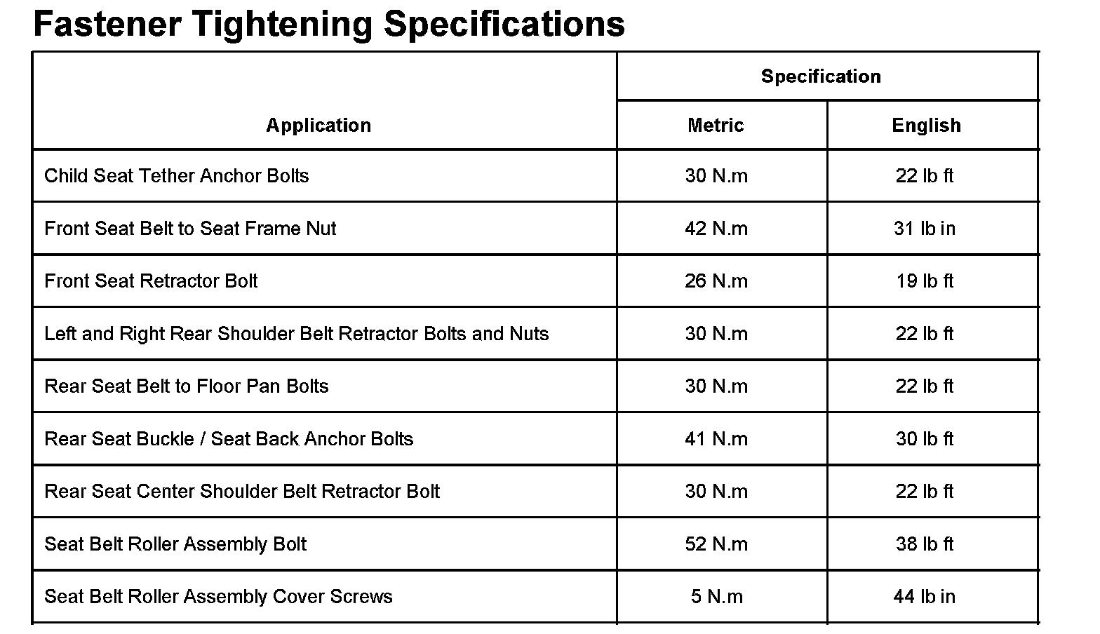 Fastener Tightening Specifications: