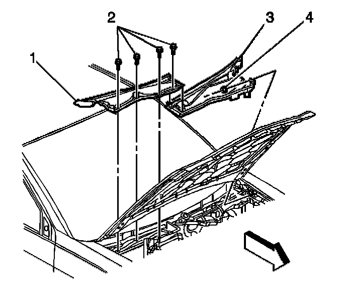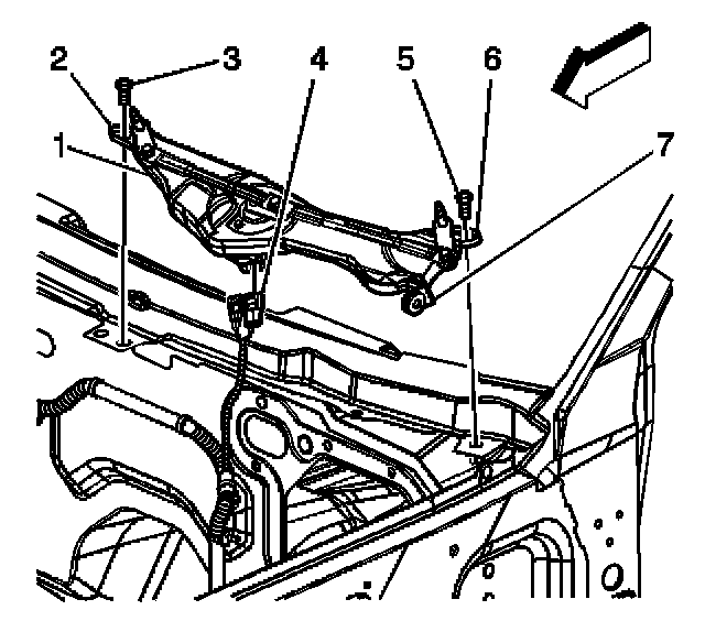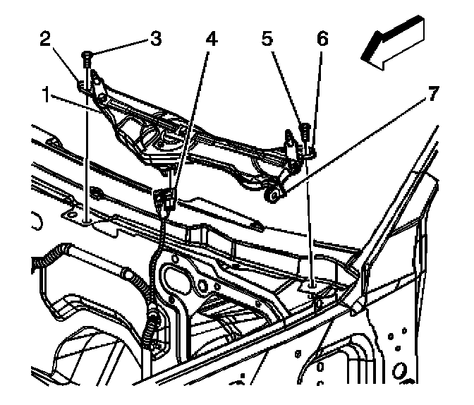 3. Align the wiper module locator hole (7) to the pin located inside rail of the driver side fender.