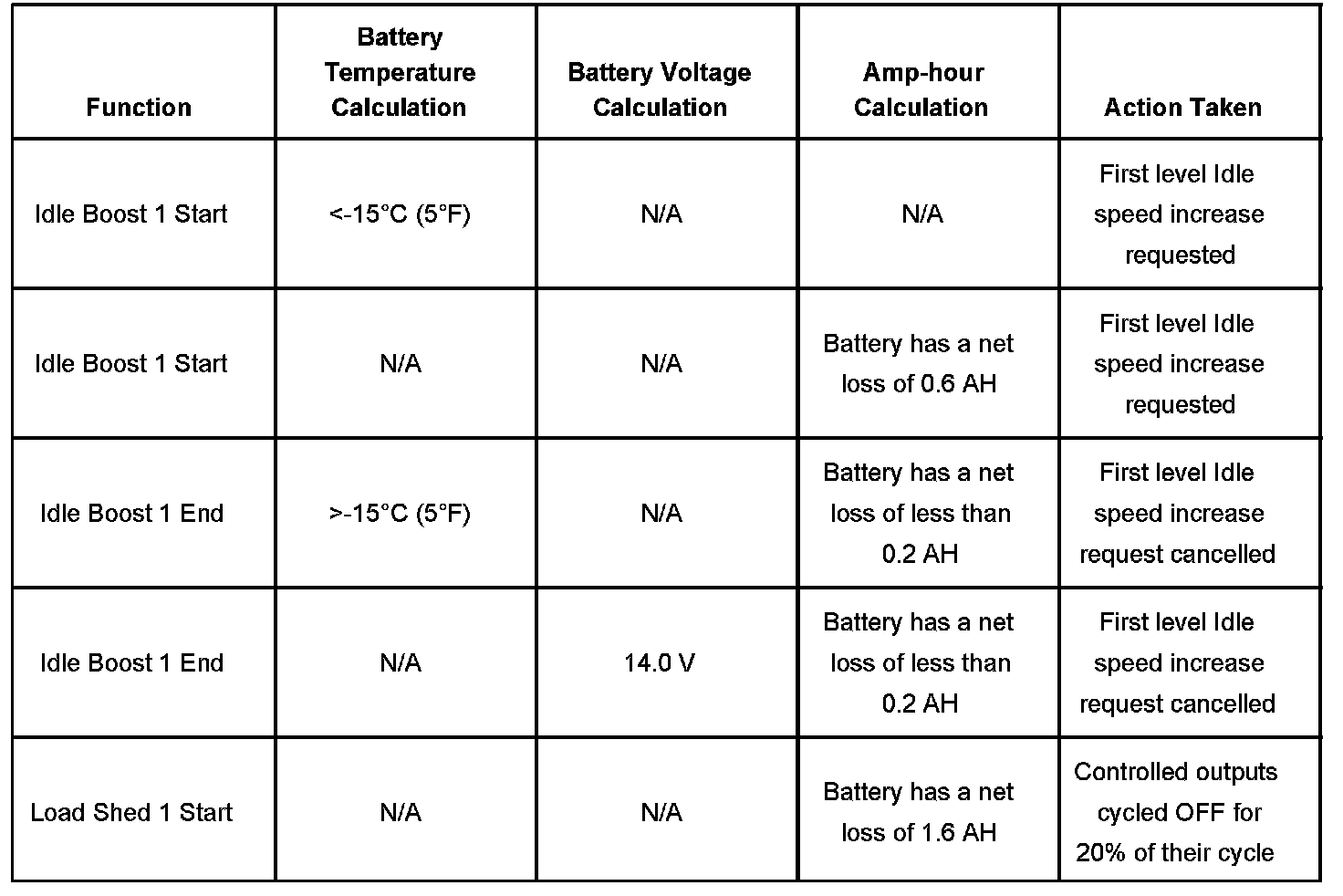 The PMM will either request an increase in the engine idle speed to the PCM or the PMM will cycle or turn off loads, called the load-shed function, in order to preserve the vehicle electrical system operation. The criteria used by the PMM to regulate this electrical load management are outlined below: