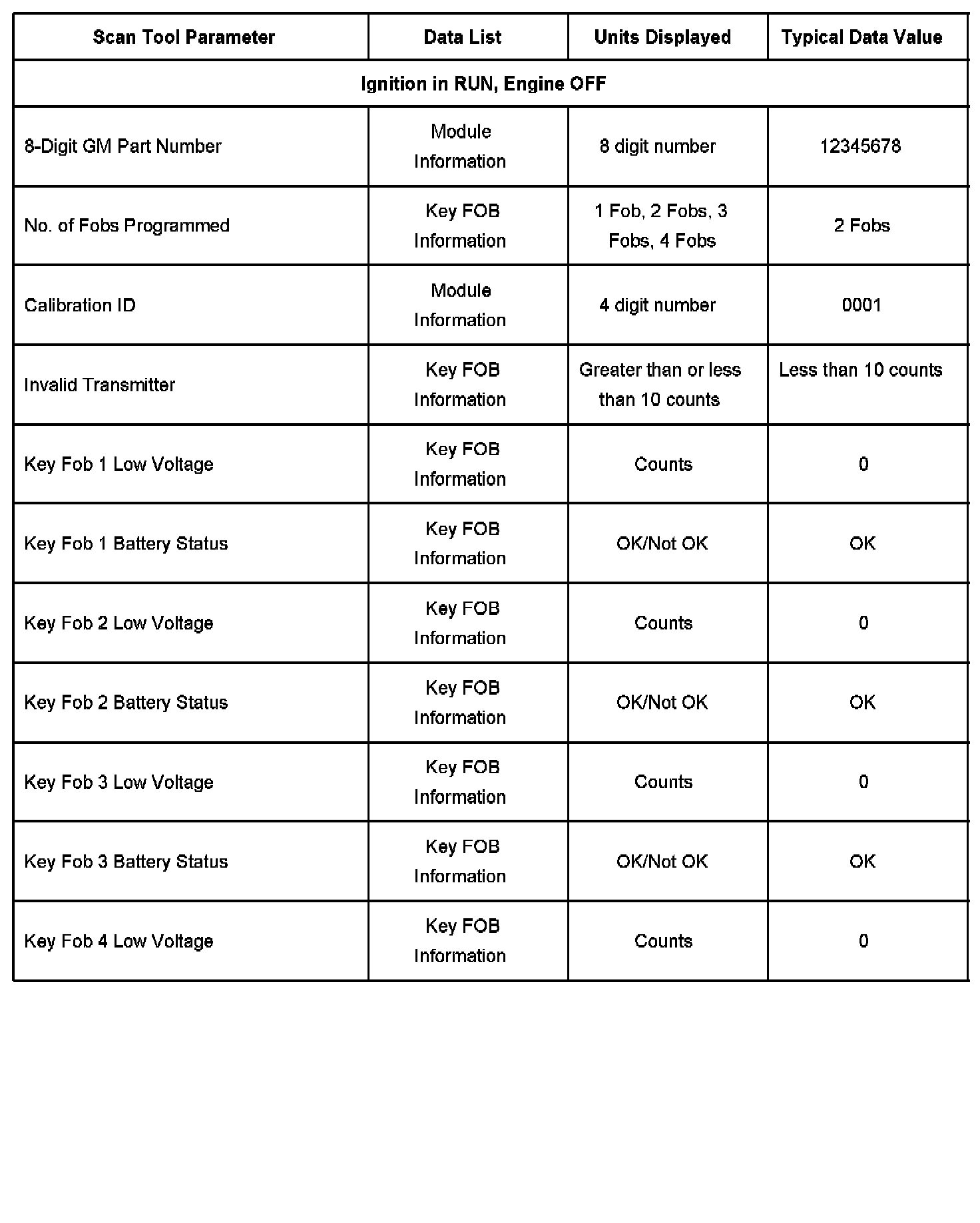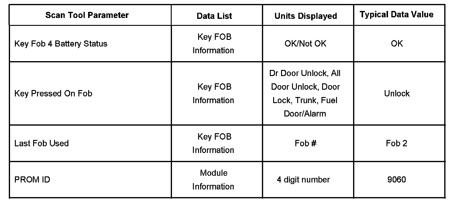 The Keyless Entry Scan Tool Data List contains all of the keyless entry related parameters that are available on the scan tool. The parameters in the list are arranged in alphabetical order. The column, "Data List," indicates the location of the parameter within the scan tool menu selections. Use the Keyless Entry Scan Tool Data List as directed by a diagnostic table or in order to supplement the diagnostic procedures. Begin all of the diagnostic procedures with Diagnostic System Check - Remote Keyless Entry.