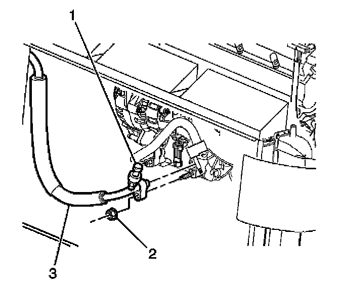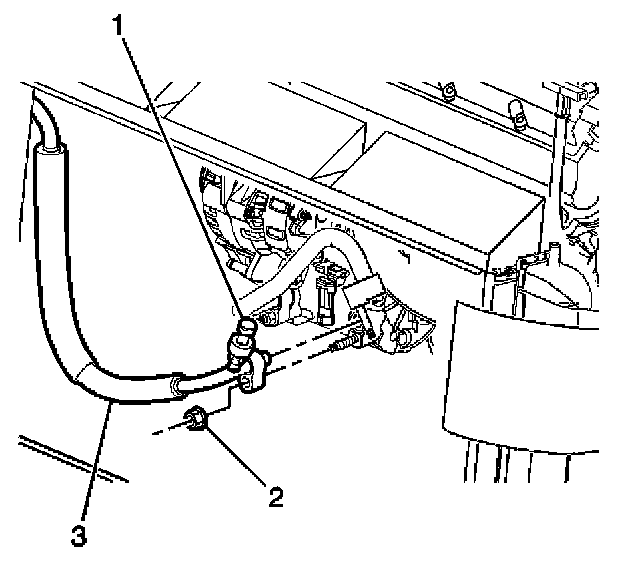 9. Remove the nut (2) from the discharge hose (3) and disconnect the discharge hose (3) from the A/C compressor.