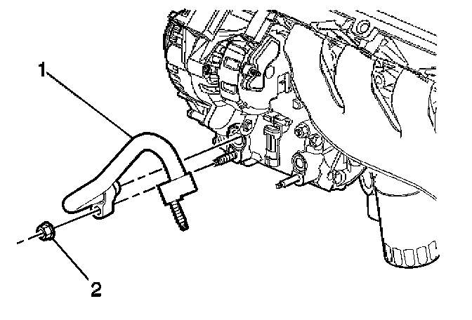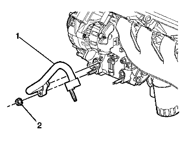 10. Remove the nut (2) from the suction hose (1) and disconnect the suction hose fitting (1) from the A/C compressor.