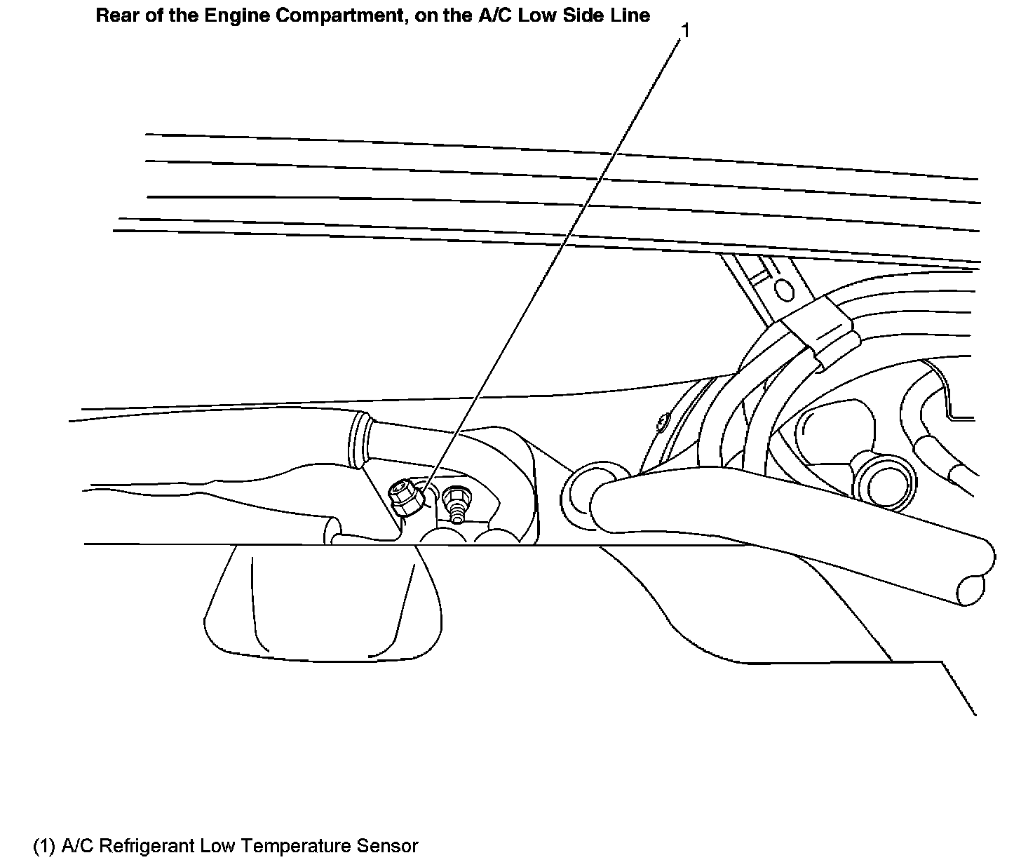 Rear of the Engine Compartment, on the A/C Low Side Line: