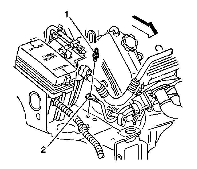 2. Remove the bolt (1) securing the engine ground cable (2) to the right side body frame rail.
