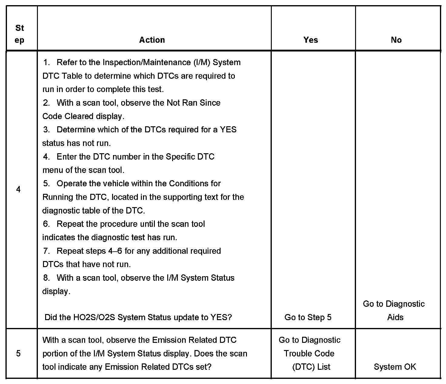 3. This step identifies a first failure of a type B DTC. A DTC only appears on the I/M System Status display when the DTC becomes a MIL illuminating DTC. This occurs on the second failure of a type B DTC. A first failure of a type B DTC will not allow the I/M System Status to update to YES. Refer to Diagnostic Aids.
