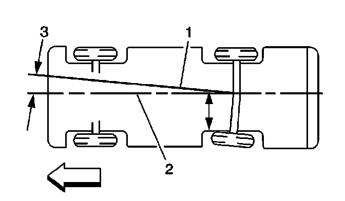 In the illustration, toe-in is shown on the left rear wheel, moving the thrust line (1) off center. The resulting deviation from the centerline is the thrust angle