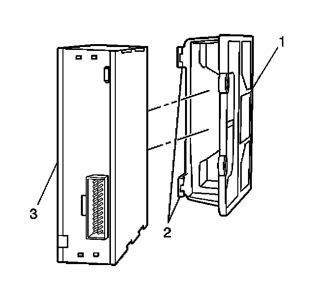 5. Release the cellular telephone module mounting bracket retaining tabs (2) and slide the cellular telephone module (3) out of the mounting bracket (1).