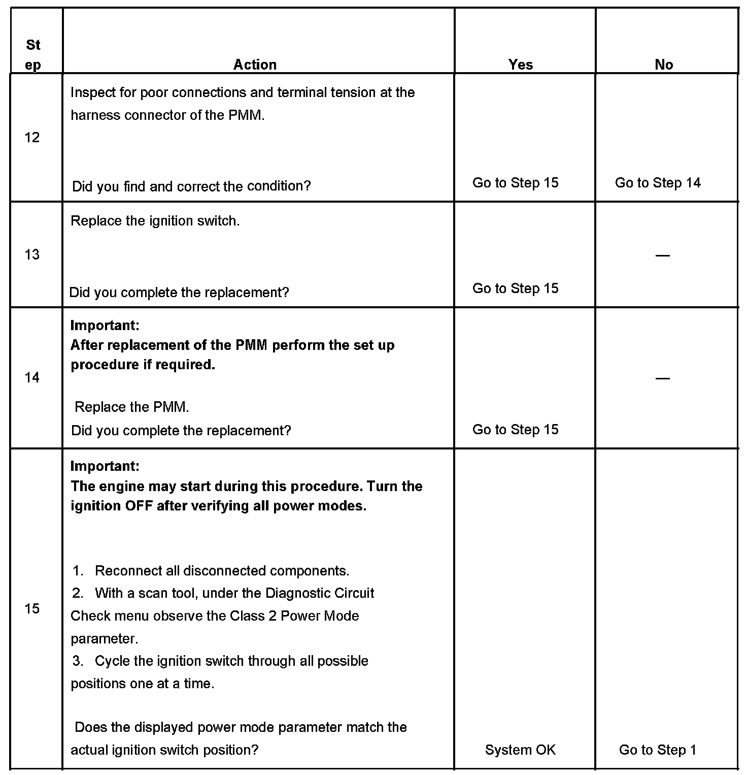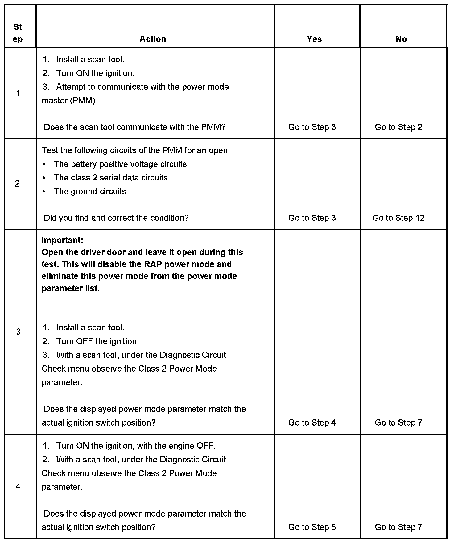 Normal vehicle class 2 communications and module operations will not begin until the system power mode has been identified. Discrete wires from the ignition switch contacts are monitored by the power mode master (PMM) module in order to determine the correct power mode. The PMM communicates the system power mode to all class 2 modules on the class 2 serial data line. Refer to Body Control System Description and Operation to identify which module is the PMM and the applicable power mode look up table.