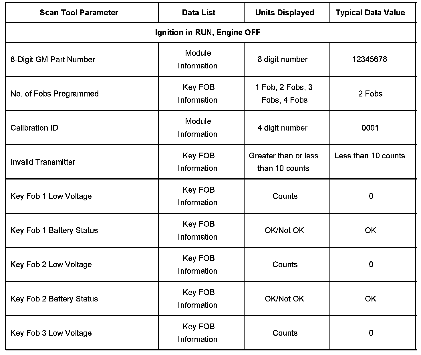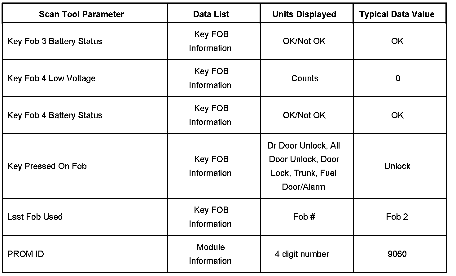 The Keyless Entry Scan Tool Data List contains all of the keyless entry related parameters that are available on the scan tool. The parameters in the list are arranged in alphabetical order. The column, "Data List," indicates the location of the parameter within the scan tool menu selections. Use the Keyless Entry Scan Tool Data List as directed by a diagnostic table or in order to supplement the diagnostic procedures. Begin all of the diagnostic procedures with Diagnostic System Check - Remote Keyless Entry.