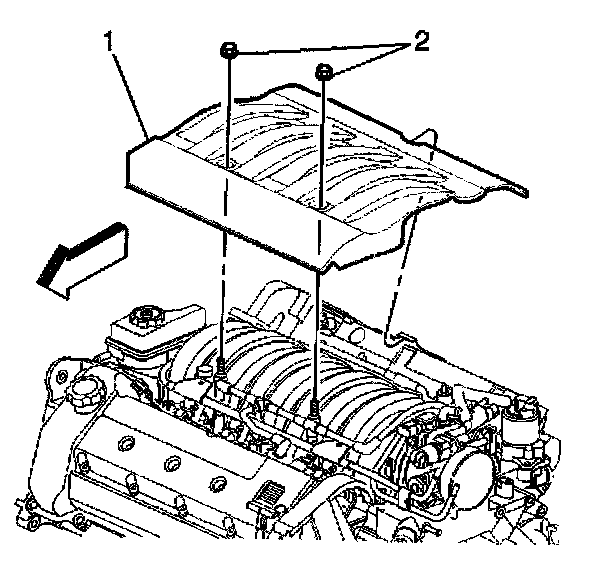 1. Remove the 2 nuts (2) from the intake manifold sight shield (1).