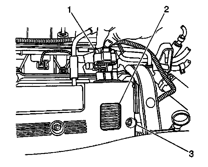 12. Remove the 4 bolts (1) attaching the fuel rail (2) to the intake manifold (3).