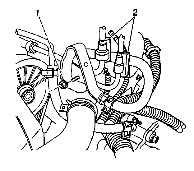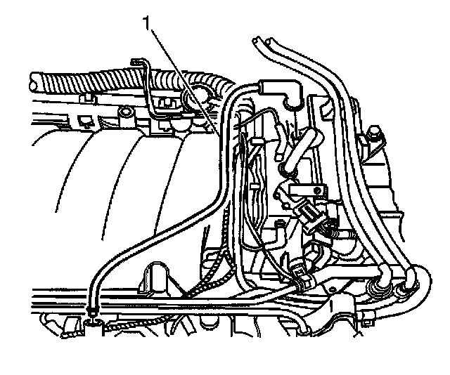 12. Position the engine coolant heater wire (1) or to the fuel rail studs (if equipped).