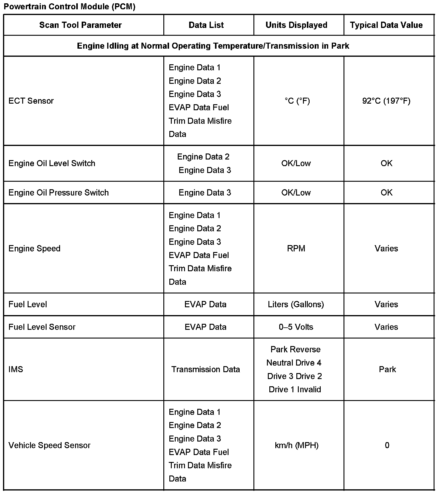 Scan Tool Data List - Powertrain Control Module (PCM)