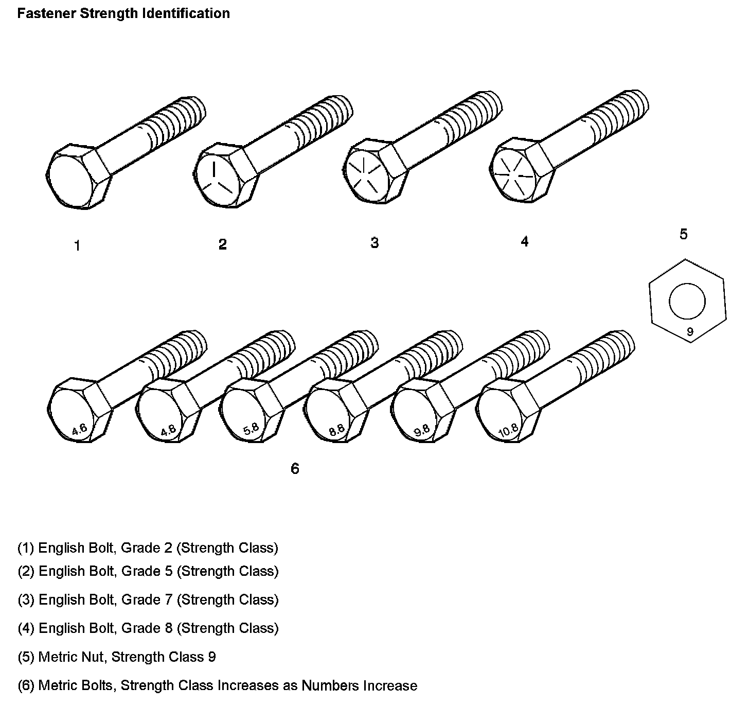The most commonly used metric fastener strength property classes are 9.8 and 10.9. The class identification is embossed on the head of each bolt. The English, inch strength classes range from grade 2 to grade 8. Radial lines are embossed on the head of each bolt in order to identify the strength class. The number of lines on the head of the bolt is 2 lines less than the actual grade. For example, a grade 8 bolt will have 6 radial lines on the bolt head. Some metric nuts are marked with a single digit strength identification number on the nut face.