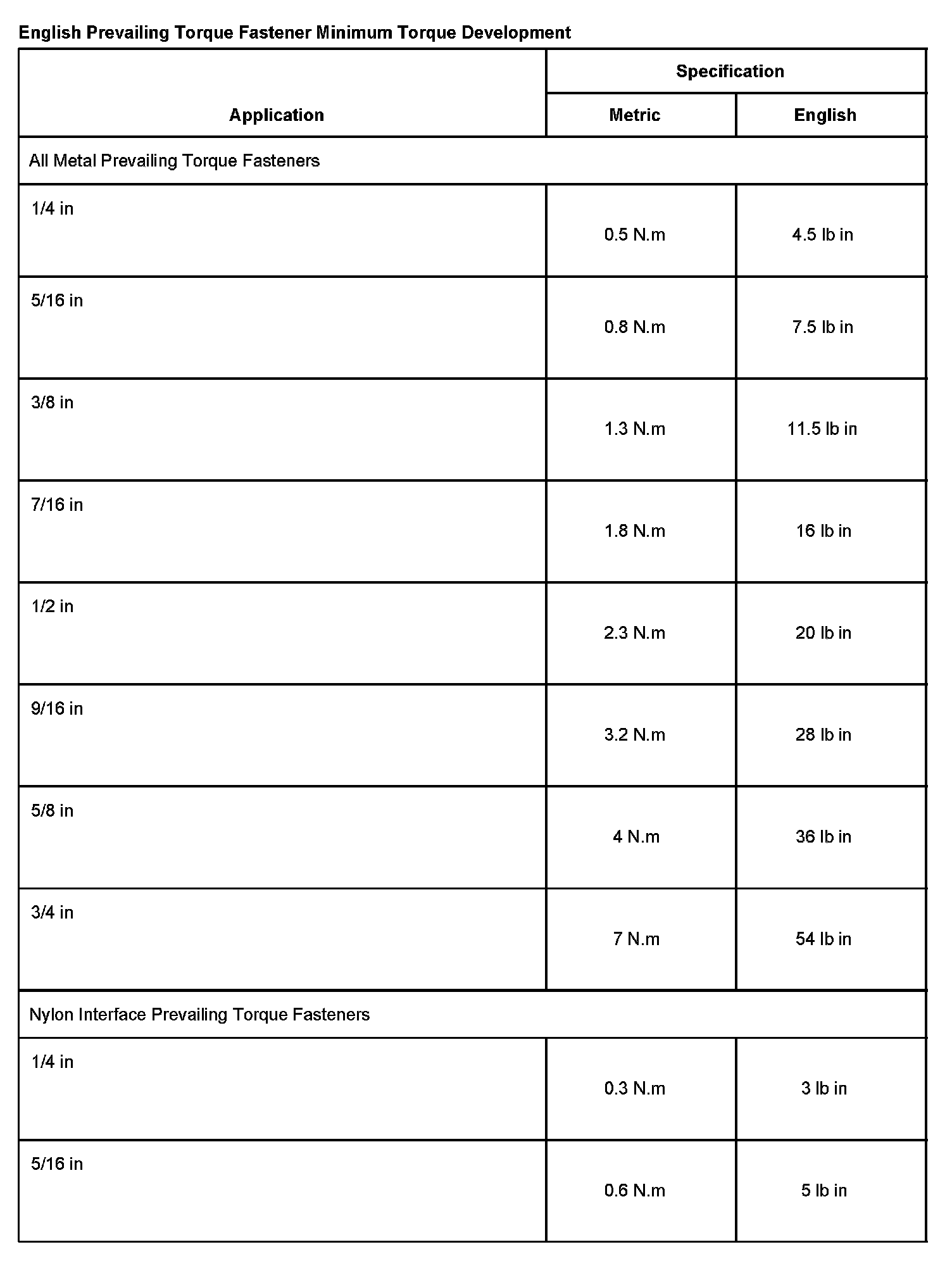 ENGLISH PREVAILING TORQUE FASTENER MINIMUM TORQUE DEVELOPMENT