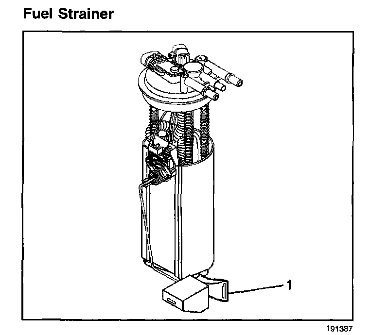 The fuel strainer (1) attaches to the lower end of the fuel sender. The fuel strainer is made of woven plastic. The functions of the fuel strainer are to filter contaminants and to wick fuel. The fuel strainer is self-cleaning and normally requires no maintenance. Fuel stoppage at this point indicates that the fuel tank contains an abnormal amount of sediment or water.