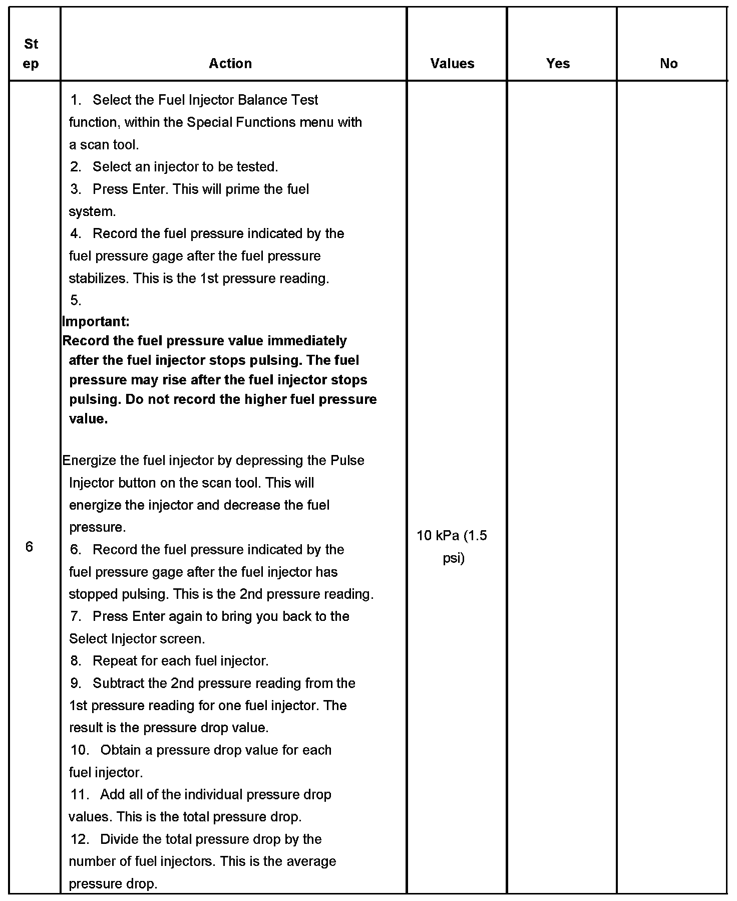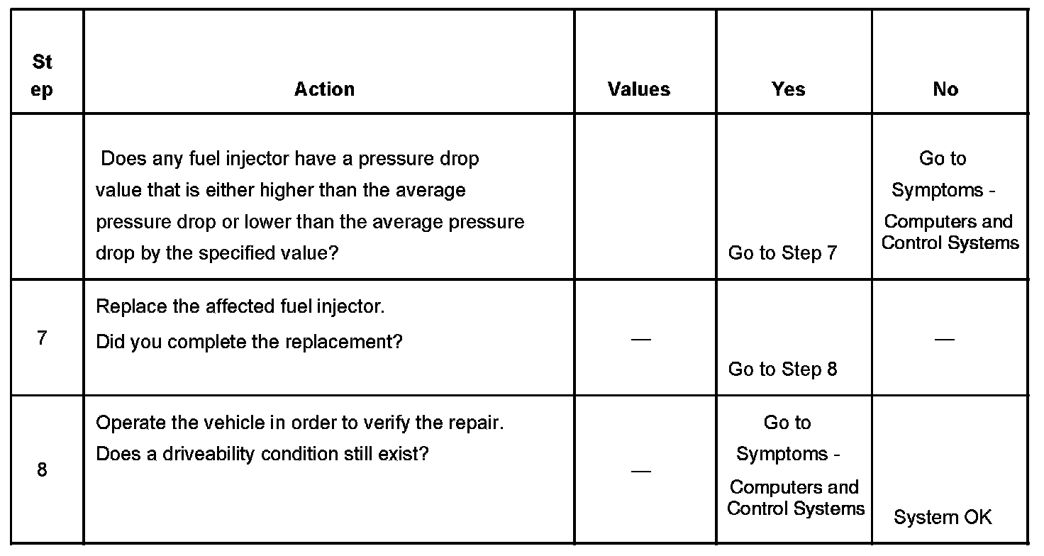 6. If the pressure drop value for each fuel injector is within 10 kPa (1.5 psi) of the average pressure drop value, the fuel injectors are flowing properly. Calculate the pressure drop value for each fuel injector by subtracting the second pressure reading from the first pressure reading.