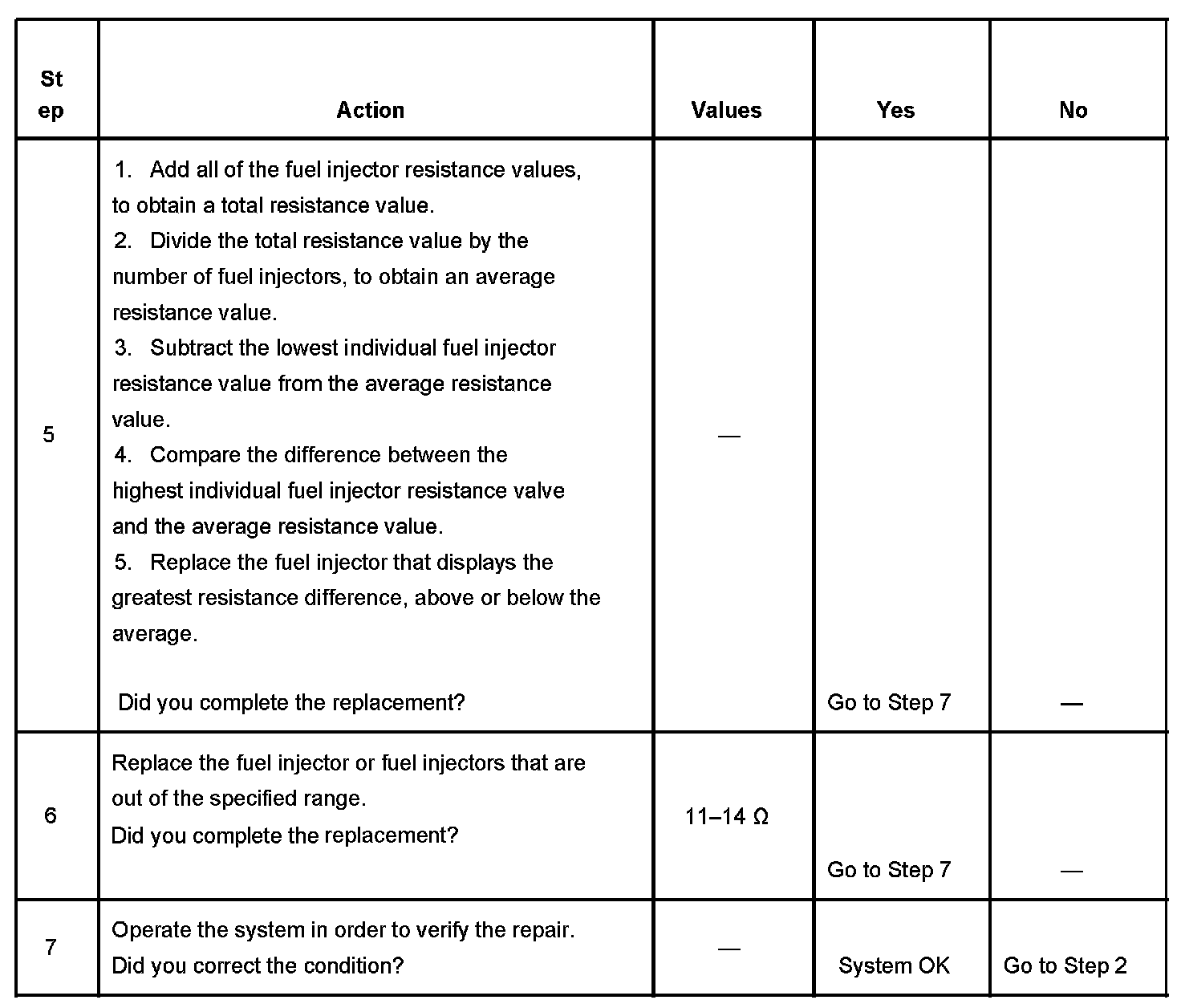 3. This step tests each fuel injector resistance within a specific temperature range. If any of the fuel injectors display a resistance outside of the specified value, replace the fuel injector.