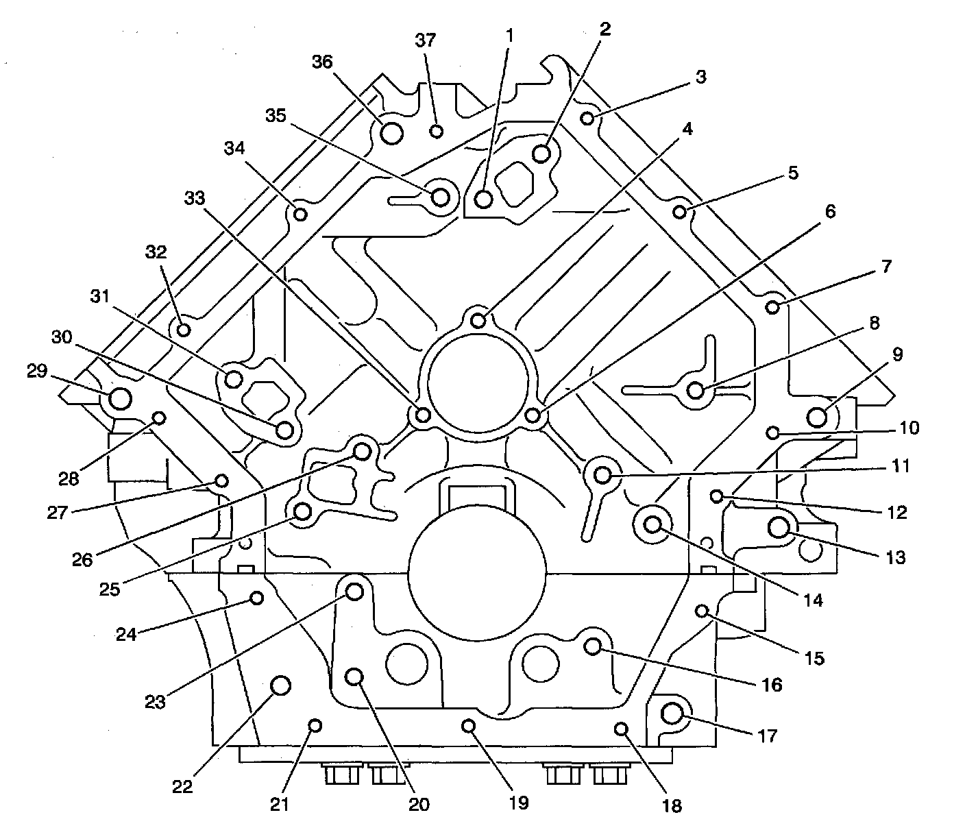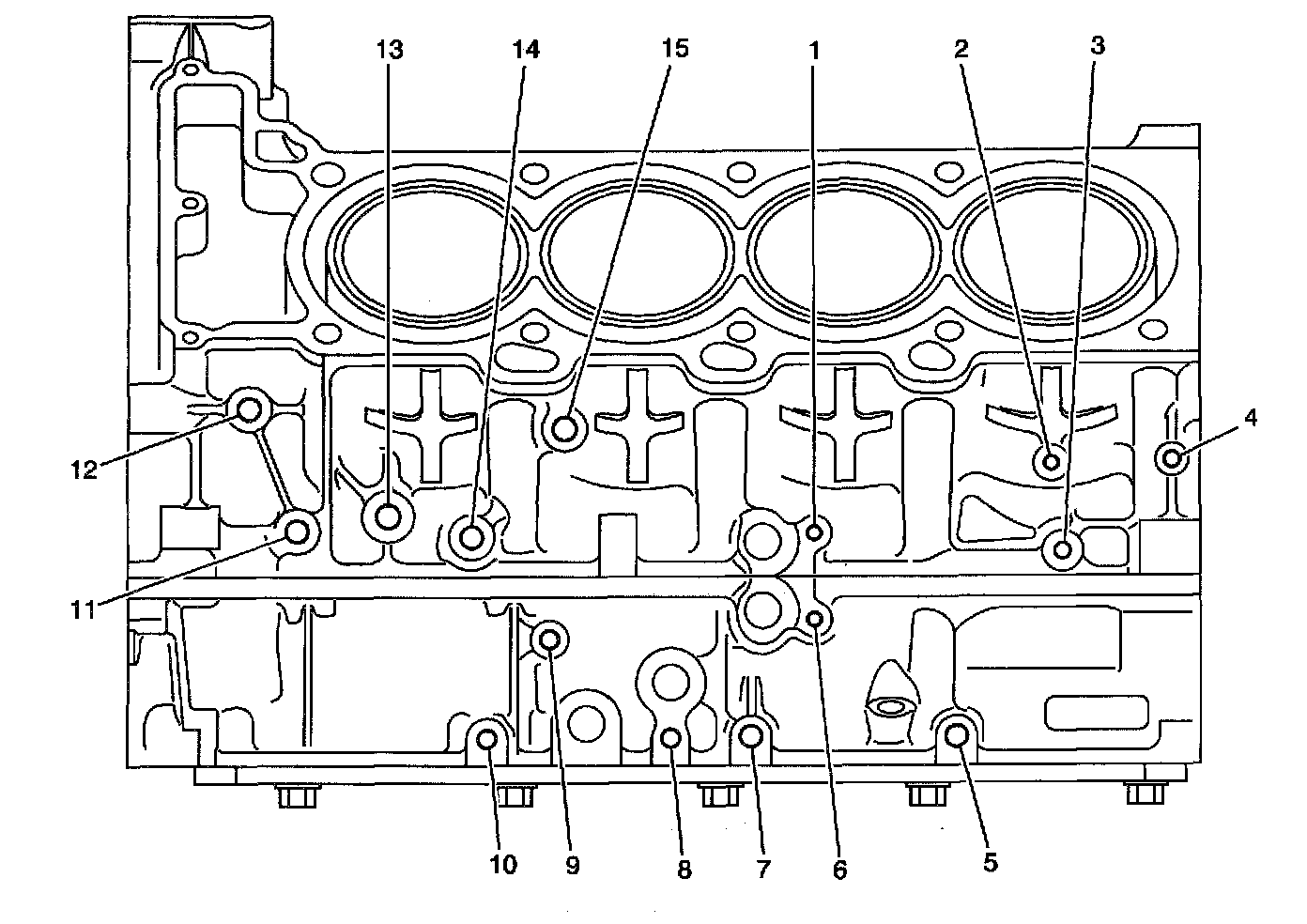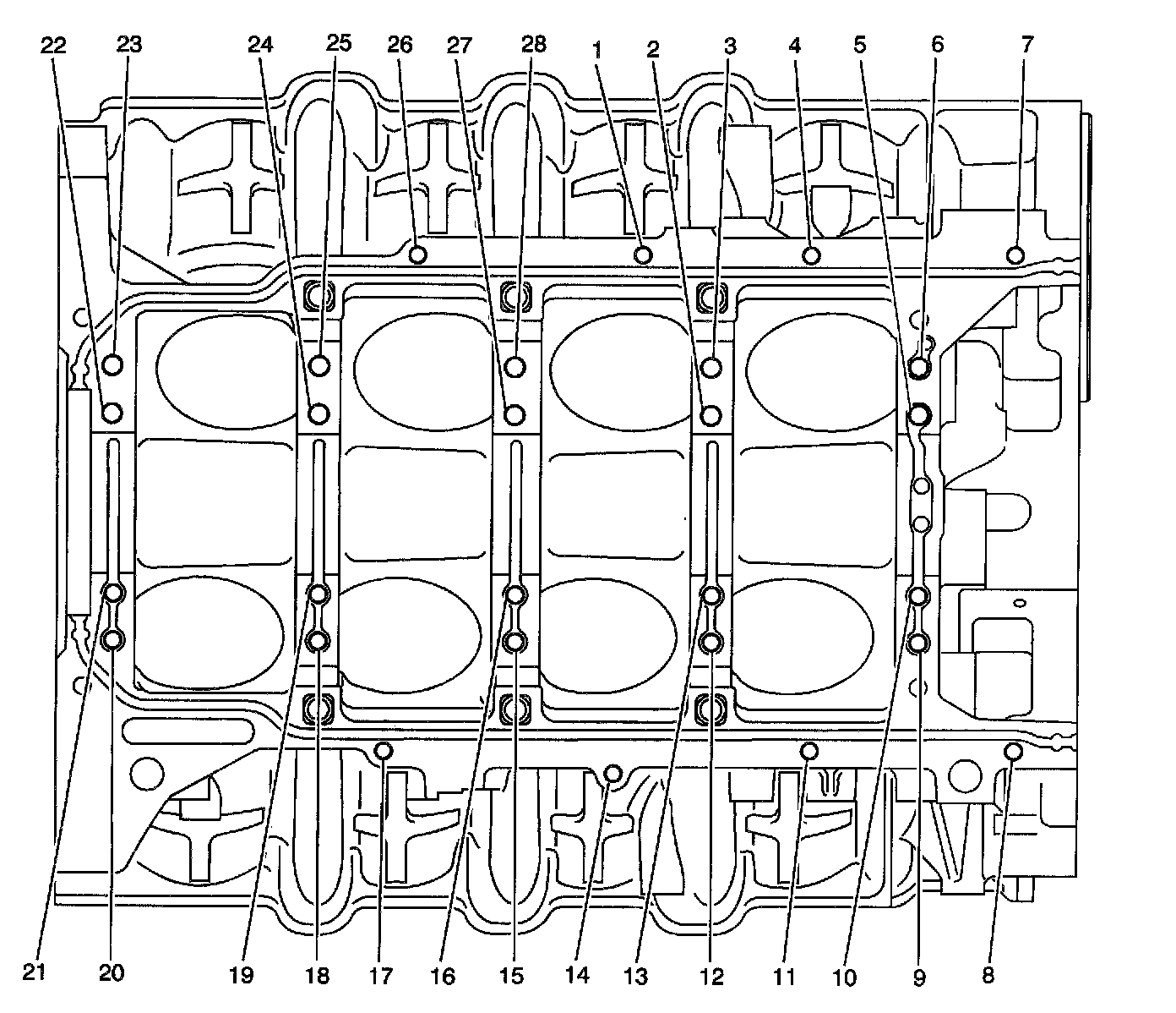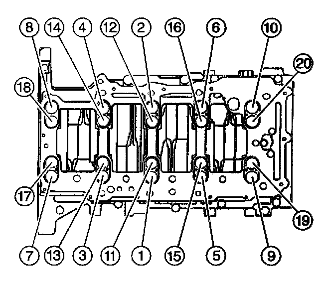Tighten the lower crankcase bearing bolts (1 through 20) to 20 Nm (15 ft. lbs.) in the proper sequence.