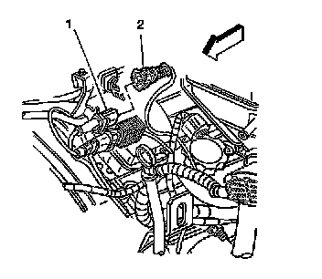 ^ Tighten the remote power steering fluid reservoir to intake plenum mounting bolts (1) to 9 Nm (80 inch lbs.).