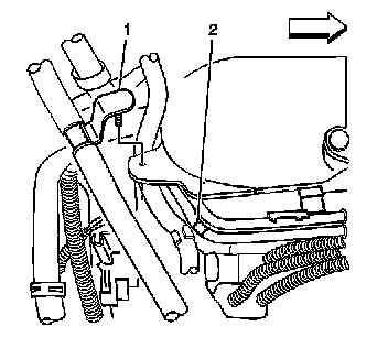 11. Position the remote power steering fluid reservoir (2) to the engine.