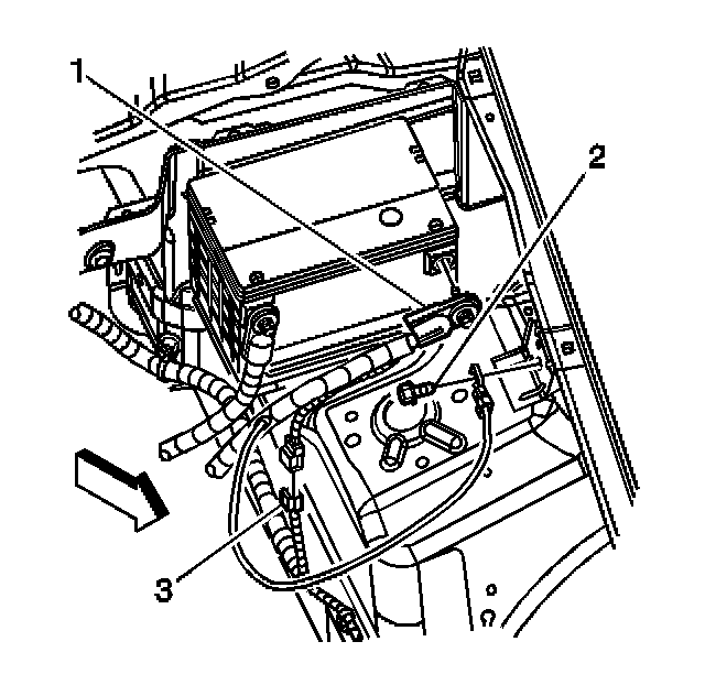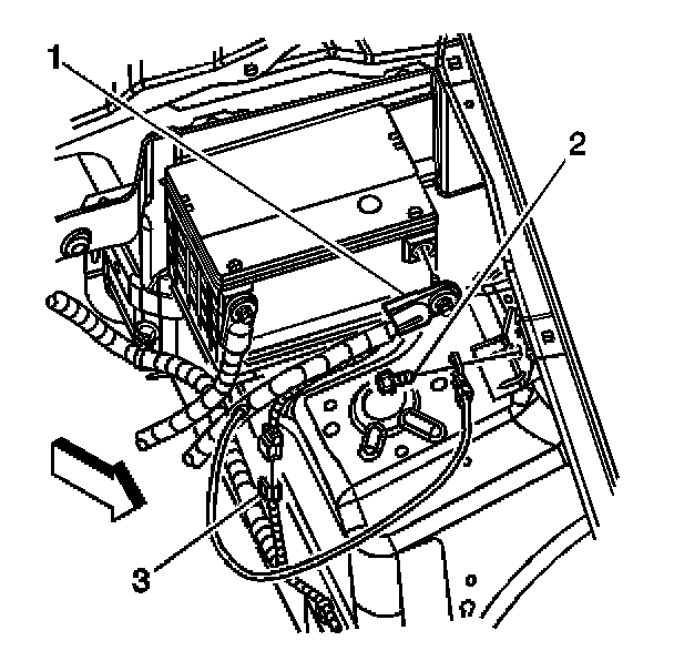4. Install the bolt (2) securing the battery negative cable to the side rail.