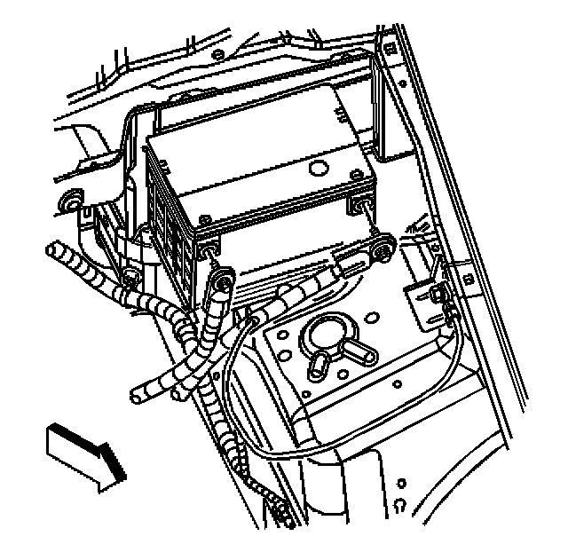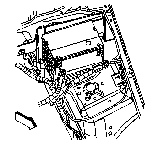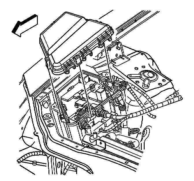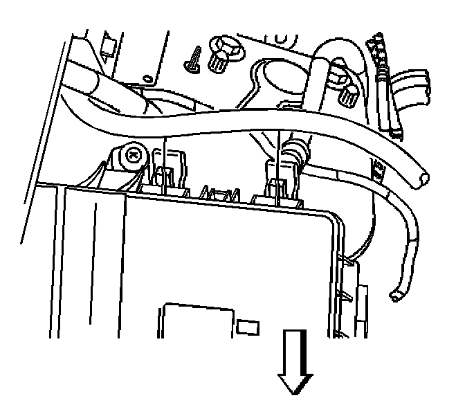3. Remove the surge tank inlet hose from the retaining feature of the underhood fuse block cover.