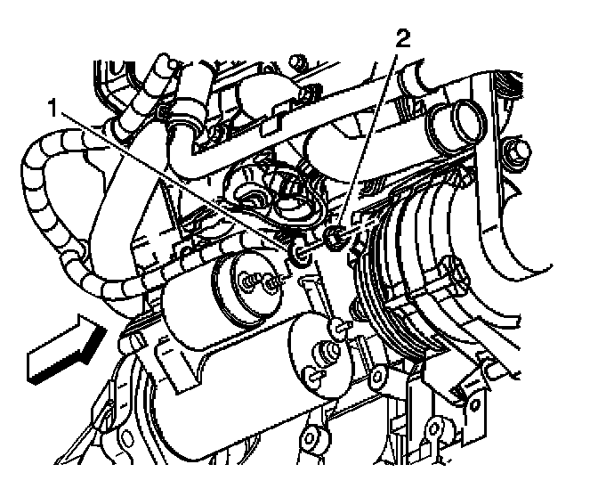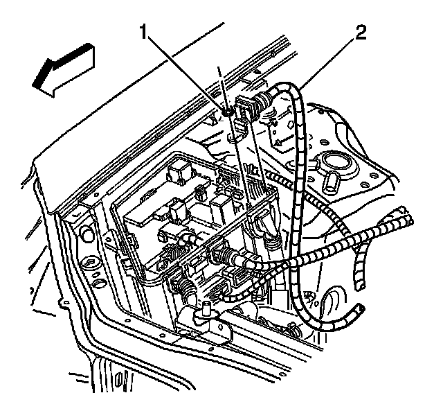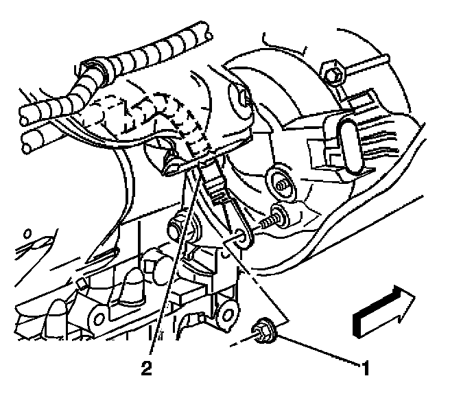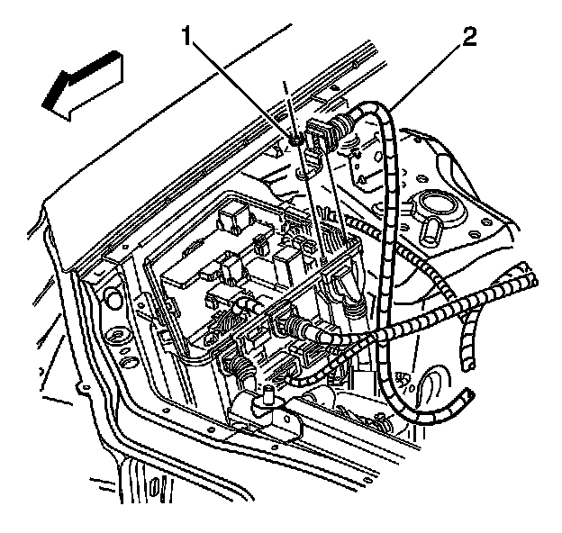 5. Remove the nut (1) securing the battery positive cable (2) to the underhood fuse block.