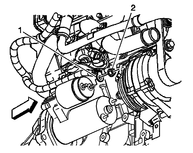 9. Remove the starter terminal nut (2) and disconnect the battery positive cable (1) from the starter.