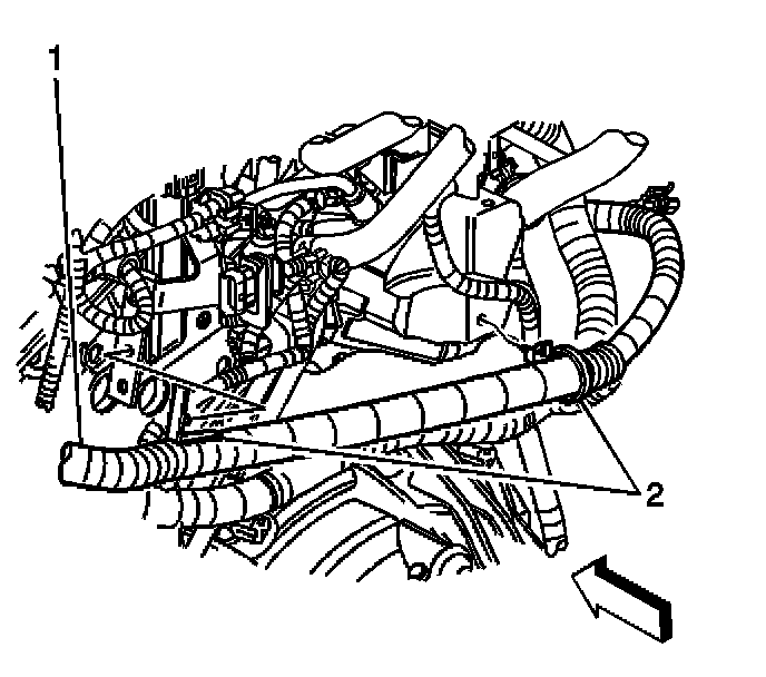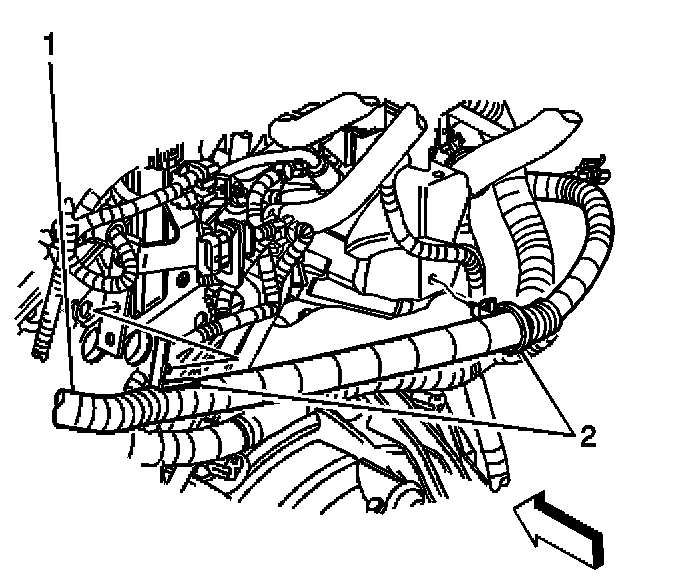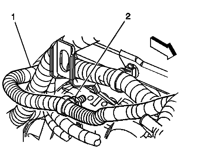 1. Position the battery positive cable (1) to the engine. Connect the cable harness clips (2) to the rear bracket and vent housing.