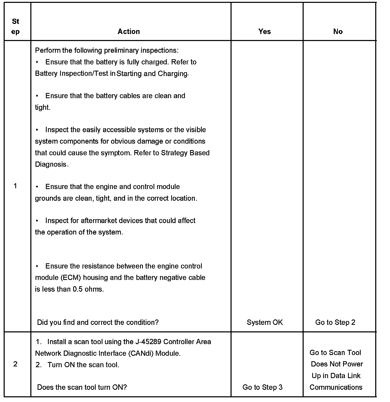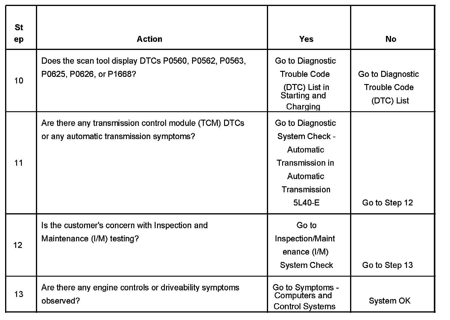 The Diagnostic System Check-Computers and Control Systems is an organized approach to identifying a condition that is created by a malfunction in the engine control system. The Diagnostic System Check must be the starting point for any driveability concern. The Diagnostic System Check directs the service technician to the next logical step in order to diagnose the concern. Understanding and correctly using the diagnostic table reduces diagnostic time and prevents the replacement of good parts.