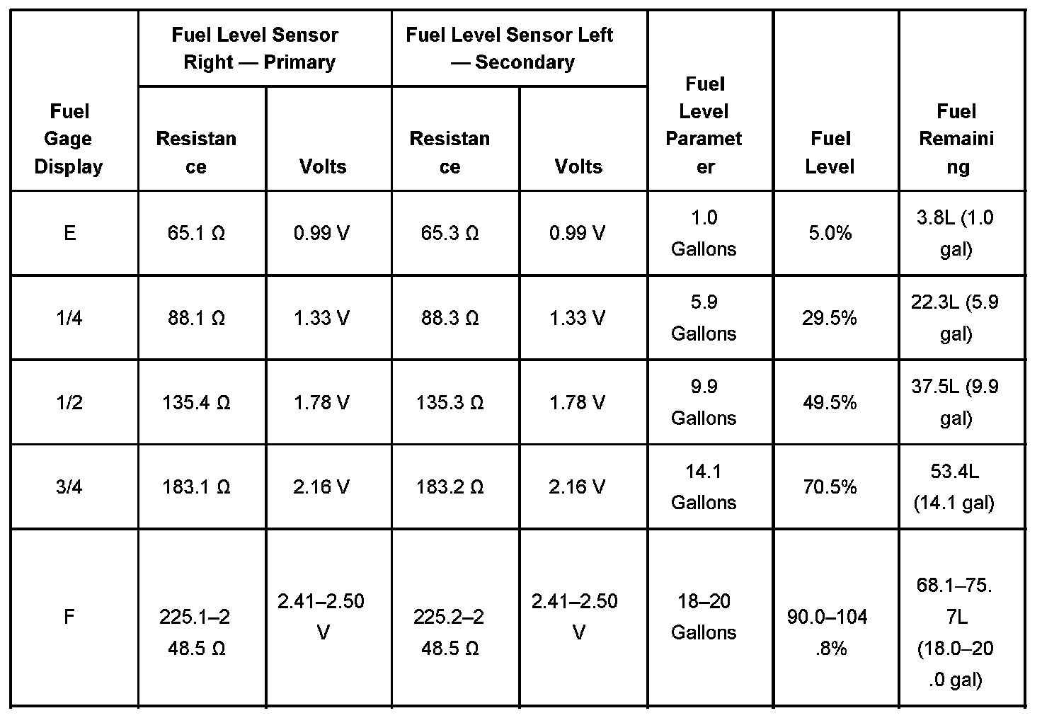 FUEL LEVEL SPECIFICATIONS