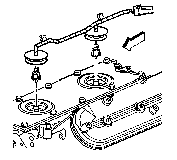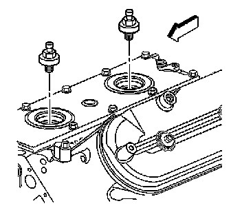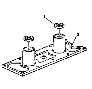 1. Install NEW knock sensor oil seals (1) into the valley cover (2).Lubricate the seal surfaces with clean engine oil.