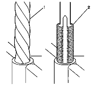 13. Inspect the insert for proper installation into the hole. A properly installed insert (1) will be either flush or slightly below flush with the surface of the base material (2).