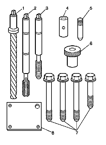 2. Install the fixture plate, bolt, and bushing, onto the engine block. Position the fixture plate and bushing over the hole that is to be repaired.