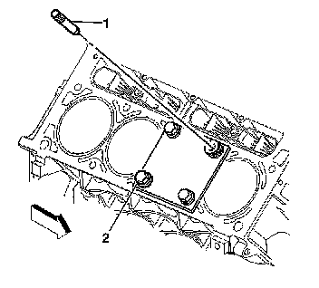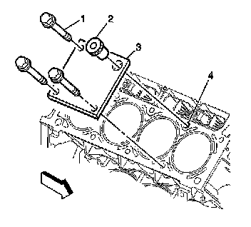 Install the fixture plate (3), bolts (1), and bushing (2) onto the engine block deck. Position the fixture plate and bushing over the hole that is to be repaired (4).