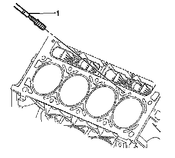 19. Install the insert and driver (1) into the hole. Rotate the driver tool until the mark on the tool aligns with the deck surface of the engine block. The installer tool will tighten up before screwing completely through the insert. This is acceptable. You are forming the bottom threads of the insert and mechanically locking the insert to the base material threads.