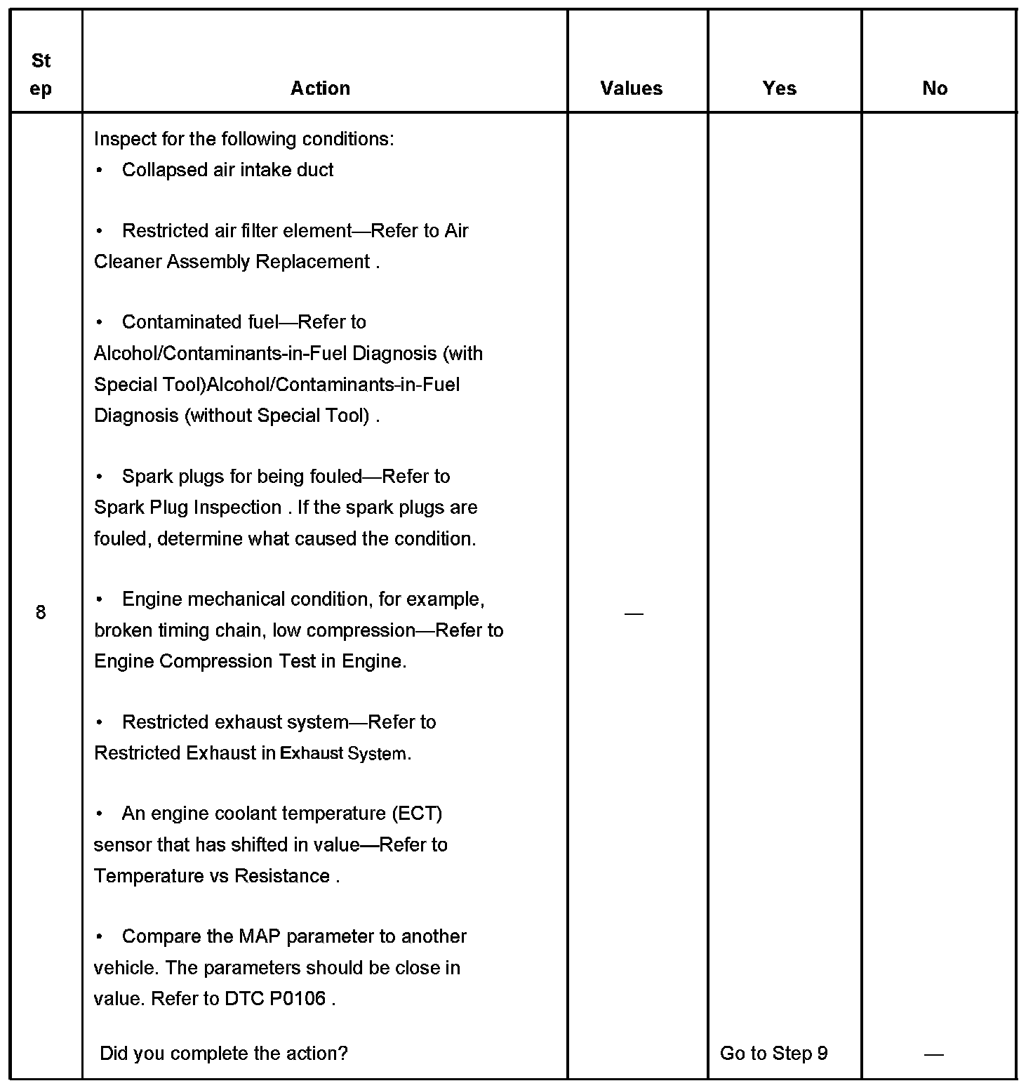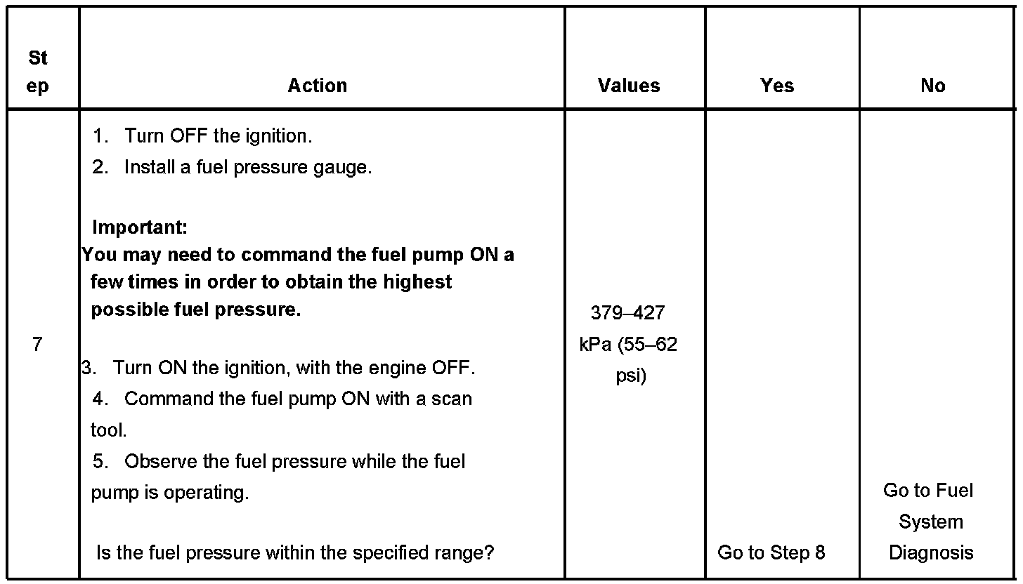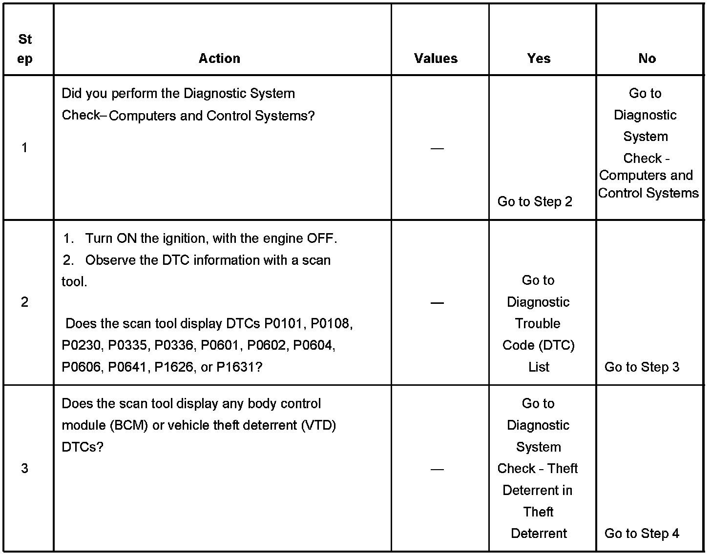 The Engine Cranks but Does Not Run diagnostic table is an organized approach to identifying a condition that causes an engine to not start. The diagnostic table directs the service technician to the appropriate system diagnosis. The diagnostic table assumes the following conditions are met: