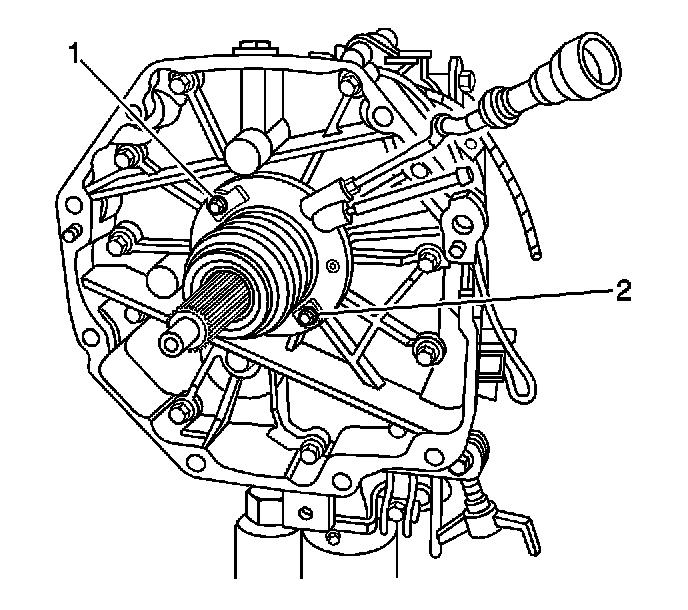 15. Remove the bolts (1, 2) securing the concentric slave cylinder to the transmission. Graphic shows transmission removed for clarity. Additional clearance between the transmission and clutch housing may be achieved by continuing to separate the transmission from the clutch housing as the bolts are being removed.