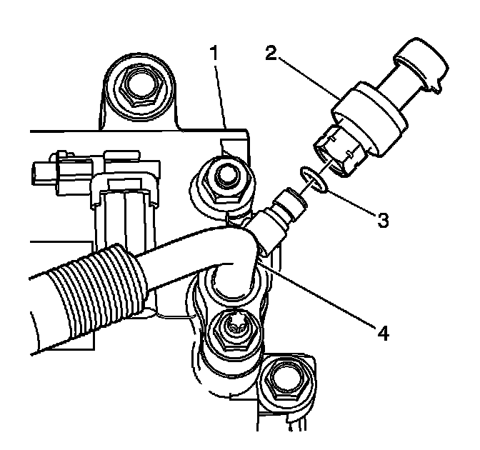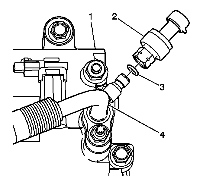 4. Remove the A/C refrigerant pressure sensor (2) from the suction hose (4).