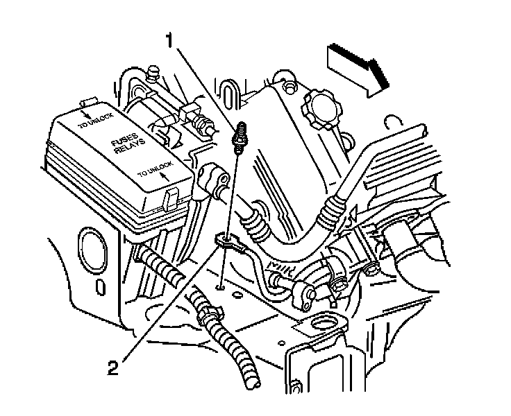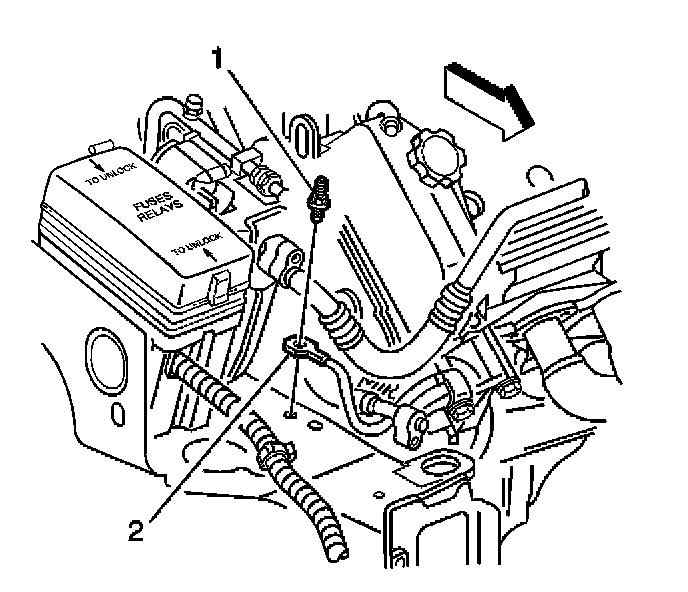 2. Remove the bolt (1) securing the engine ground cable (2) to the right side body frame rail.