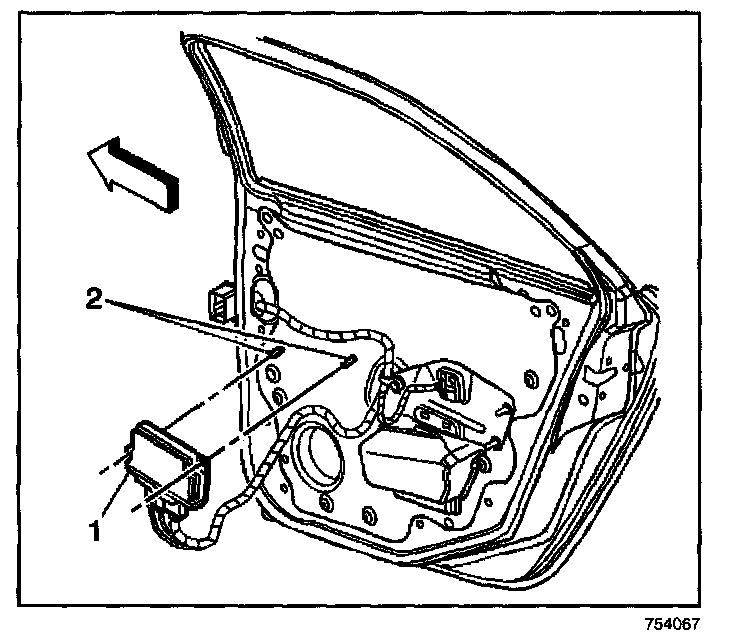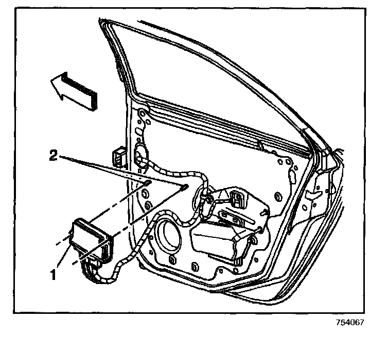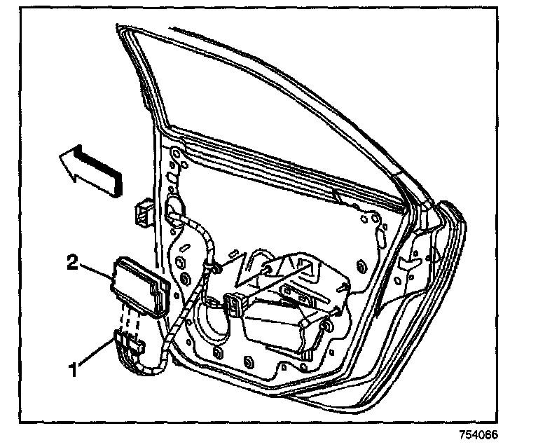 2. Remove the door control module (1) by releasing the retainer tabs (2).