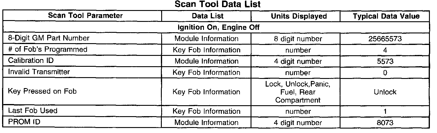 The keyless Entry Scan Tool Data List contains all of the keyless entry related parameters that are available on the scan tool. The parameters in the list are arranged in alphabetical order. The column, Data List, indicates the location of the parameter within the scan tool menu selections. Use the Keyless Entry Scan Tool Data List as directed by a diagnostic table or in order to supplement the diagnostic procedures. Begin all of the diagnostic procedures with Diagnostic System Check - Remote Keyless Entry. Use the Scan Tool Data List only after the following is determined: